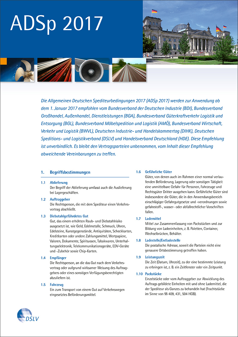 Mit Wirkung 01.01.2017 traten die neuen ADSp 2017 in Kraft. Bitte beachten Sie die wesentlichen Neuregelungen der ADSp 2017 (Allgemeinen Deutschen Spediteurbedingungen).